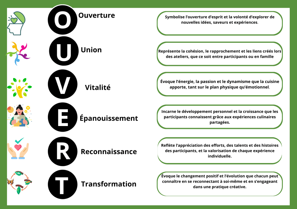 Chaque atelier est un espace d’échange, d’inspiration et de convivialité. Nous abordons la cuisine comme une métaphore de la vie, où chaque ingrédient, chaque saveur et chaque préparation représente une étape dans votre parcours personnel. En reliant la cuisine au développement personnel, nous vous invitons à :